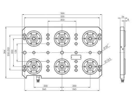 液压零点定位系统适用于T型槽间隙为63、100和125mm的机床工作台,通过M12的沉头螺栓紧固。至少有两个定位孔,以便准确定位。两个零点定位器之间的间距是200mm。液压快速接头是预先安装好的,气压除屑功能接口可选择性的接通。