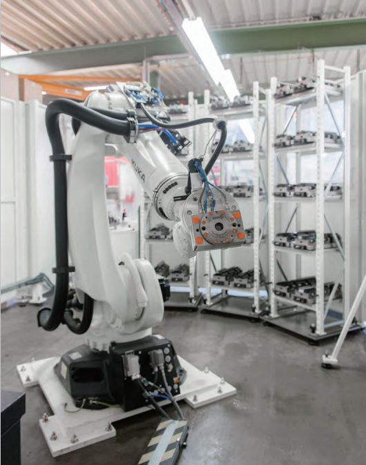 零点定位系统之机器人工具快换的应用 应用领域: 机器人工具快换可用于实现机器人末端工具的快速高精度更换,大幅度提高机器人更换工作的效率。 同时也可用于搬运和更换夹具托盘和零件。